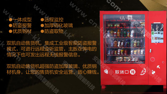 對于安全性能要求較高的客戶,安徽雙凱定制機可增加超強防盜報警系統。雙凱自動售貨機集成工業級智能防盜報警模式,可以在遠程監聽監管,主板在停電的情況下可發出遠程無限報警信息;防盜加厚玻璃、優質鋼材機身,能夠讓您安全運營,放心賺錢。
